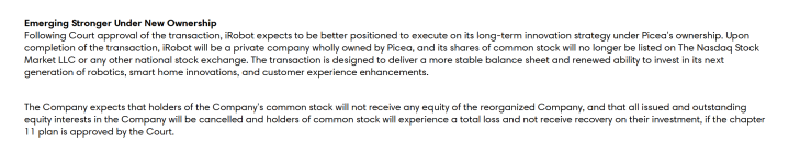 公告进一步表示,根据重组支持协议的条款,杉川将获得公司100%的股权,iRobot也将从纳斯达克交易所退市。公司同时预计,如果法院破准破产重组方案,公司普通股持有人将不会获得重组后公司的任何股权,公司所有已发行和在外的权益将被取消,普通股持有人将遭受全部损失且无法收回其投资。