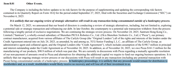 当时,iRobot就警告称,公司不太可能在破产程序之外促成任何交易,而在破产程序中,现有股东可能会失去所有的投资。