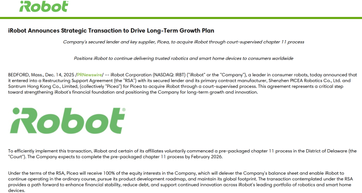 iRobot在公告中宣布,已经向美国特拉华州法院提交第11章破产保护申请,并与主要债权人、主要供应商Picea(深圳杉川机器人和香港杉川,后文统称为杉川)签署重组支持协议,由杉川通过法院监督程序收购iRobot。公司预计将在2026年2月前完成破产手续。